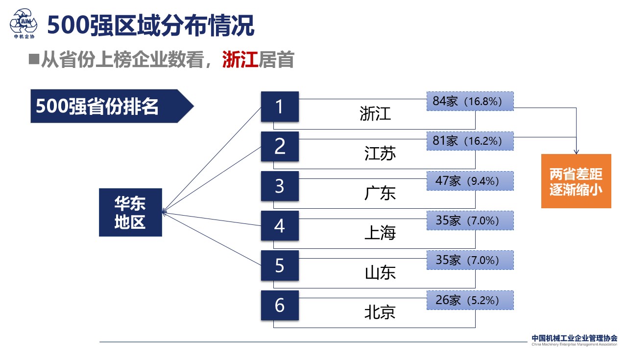 從500強上榜企業(yè)區(qū)域分布來看,全國有29個省份地區(qū)企業(yè)進入榜單,浙江省、江蘇省仍然為上榜企業(yè)大省,分別有84家、81家企業(yè)入圍,同比兩省入榜企業(yè)數(shù)量差距逐漸縮小。