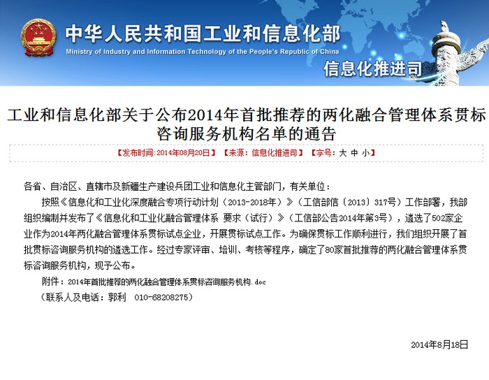 按照《信息化和工業(yè)化深度融合專項行動計劃(2013-2018年)》(工信部信〔2013〕317號)工作部署,工信部組織編制并發(fā)布了《信息化和工業(yè)化融合管理體系要求(試行)》(工信部公告2014年第3號),遴選了502家企業(yè)作為2014年兩化融合管理體系貫標(biāo)試點企業(yè),開展貫標(biāo)試點工作。為確保貫標(biāo)工作順利進(jìn)行,工信部信息化司組織開展了首批貫標(biāo)咨詢服務(wù)機(jī)構(gòu)的遴選工作。經(jīng)過專家評審、培訓(xùn)、考核等程序,確定了80家首批推薦的兩化融合管理體系貫標(biāo)咨詢服務(wù)機(jī)構(gòu),中國機(jī)械工業(yè)企業(yè)管理協(xié)會通過層層考核評審,成為80家獲得貫標(biāo)咨詢服務(wù)機(jī)構(gòu)資質(zhì)中唯一一家協(xié)會組織。