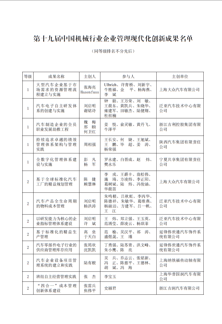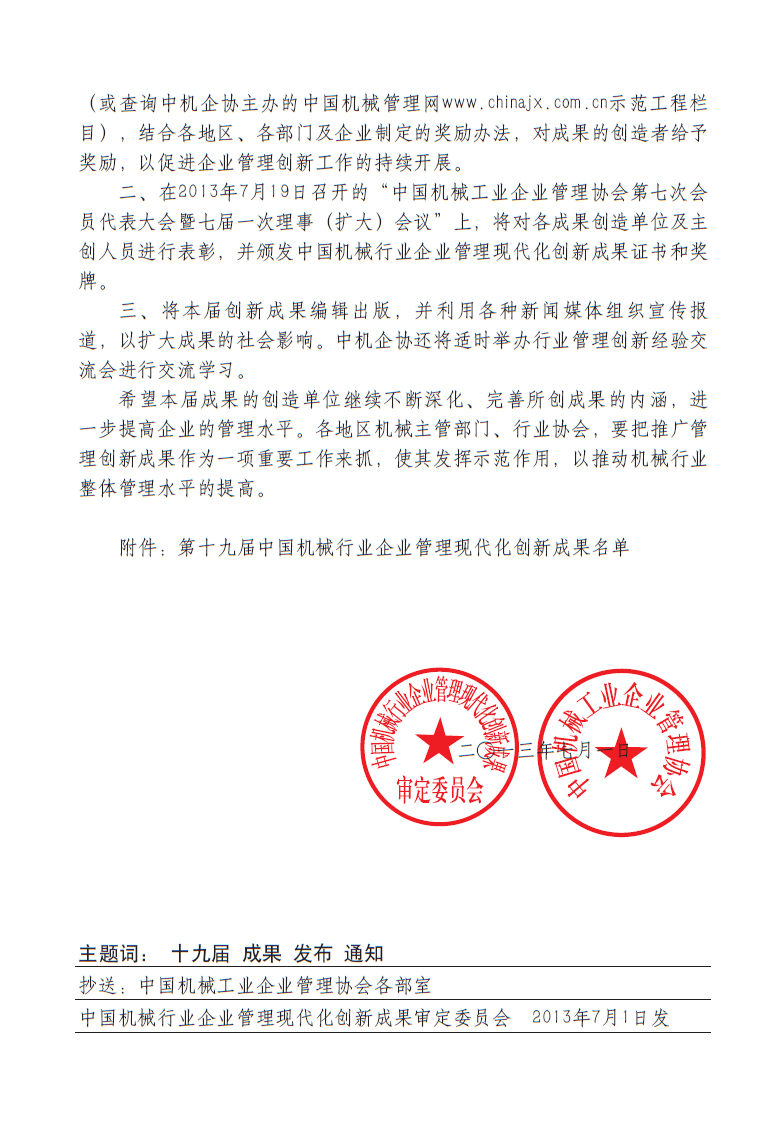 關(guān)于發(fā)布和推廣第十九屆中國機(jī)械行業(yè)企業(yè)管理現(xiàn)代化成果的通知