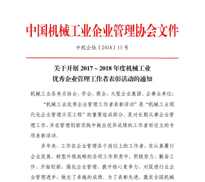 關(guān)于開展2017~2018年度機(jī)械工業(yè)優(yōu)秀企業(yè)管理工作者表彰活動的通知-中機(jī)企協(xié)〔2018〕15號.pdf