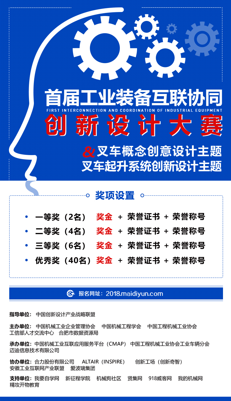 首屆工業(yè)裝備互聯(lián)協(xié)同創(chuàng)新設計大賽(叉車專題賽)是適應形勢,適應發(fā)展,適應需要,應運而生的一屆全新賽事,本屆競賽是與以往多次組織的賽事完全不同的一次大賽,是主辦方通過中國機械工業(yè)互聯(lián)應用服務平臺(CMAP)為本次大賽提供資源平臺,由CMAP邁迪云和設計工具(邁迪設計包、Inspire等)服務整個賽事;是開放的、沒有圍墻場地、沒有固定時點、凸顯設計水平的競賽。