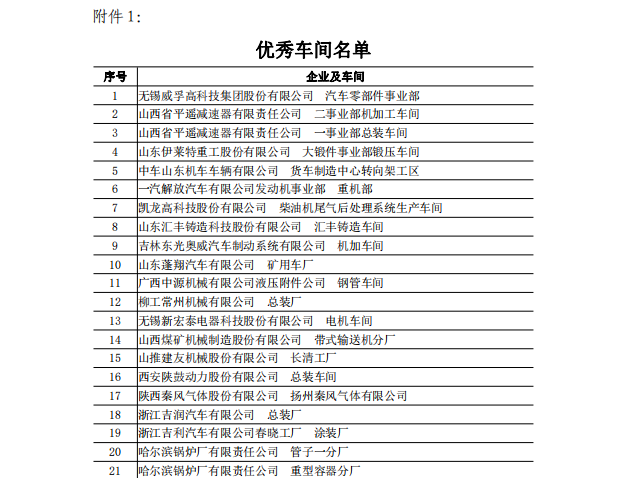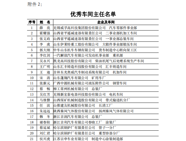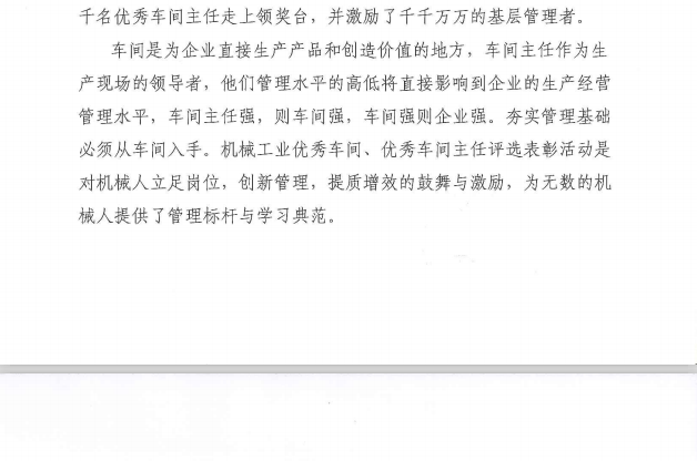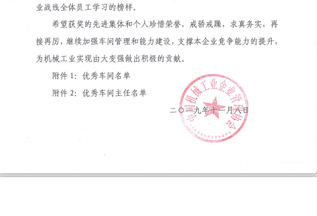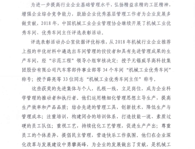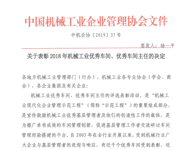 關(guān)于表彰2018年機(jī)械工業(yè)優(yōu)秀車(chē)間、優(yōu)秀車(chē)間主任的決定