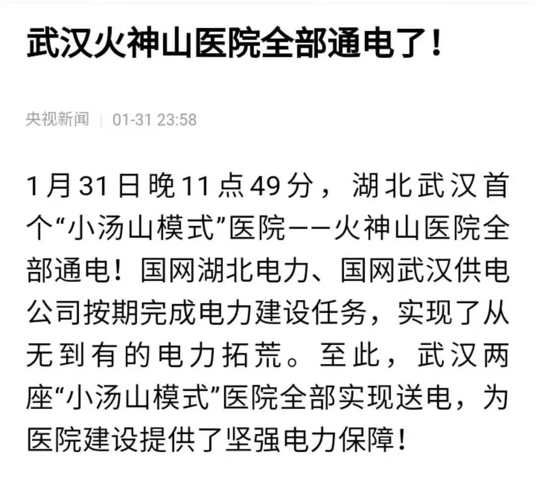 眾人拾柴,點(diǎn)亮火神山。1月31日晚11點(diǎn)49分,湖北武漢首個(gè)“小湯山模式”醫(yī)院——火神山醫(yī)院全部通電。