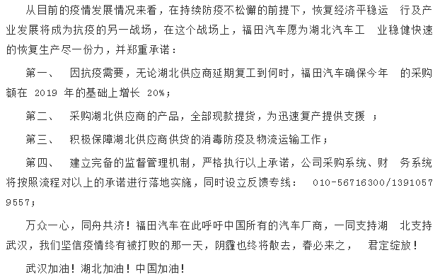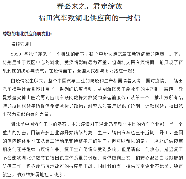 春必來之 君定綻放 福田汽車致湖北供應(yīng)商的一封信